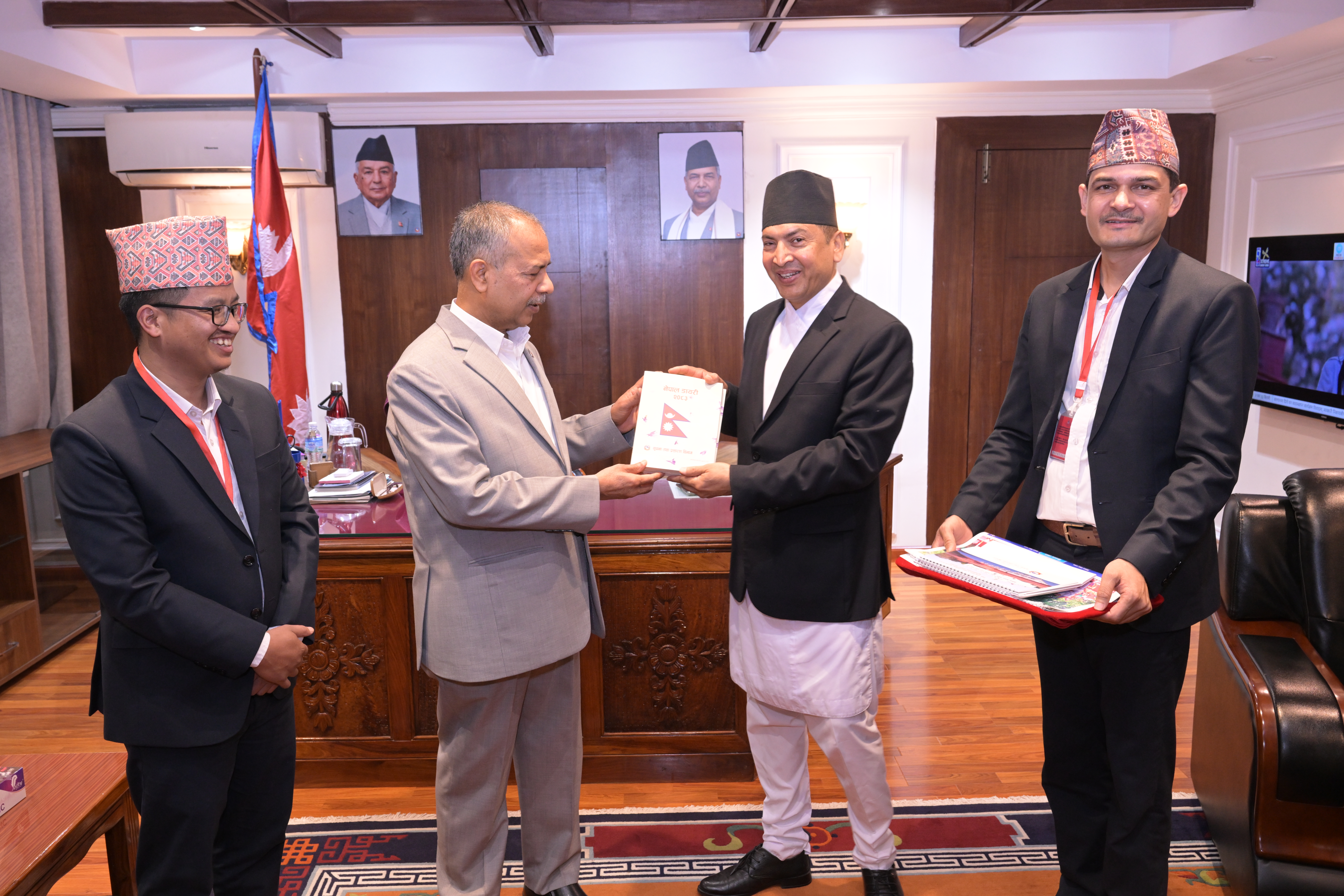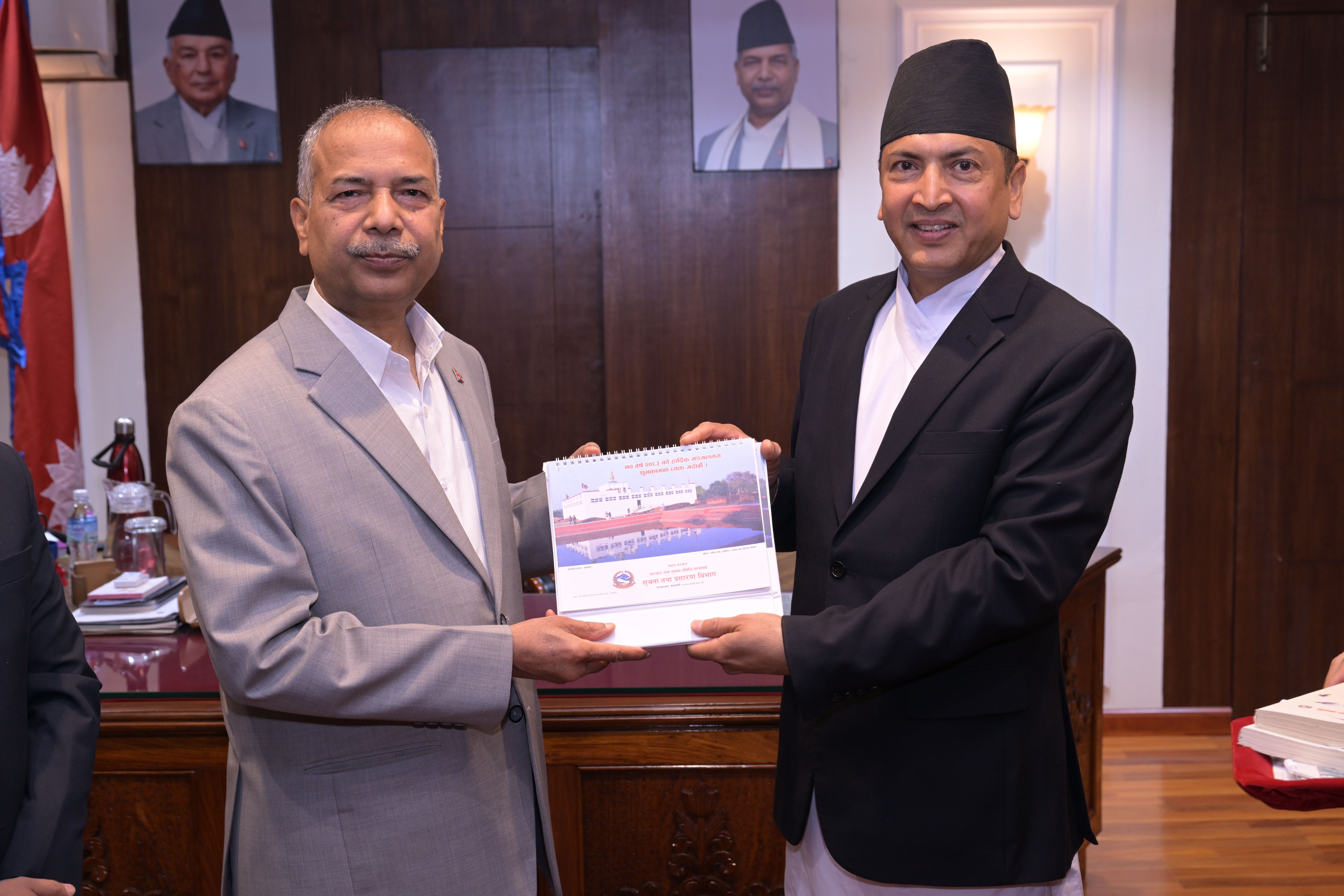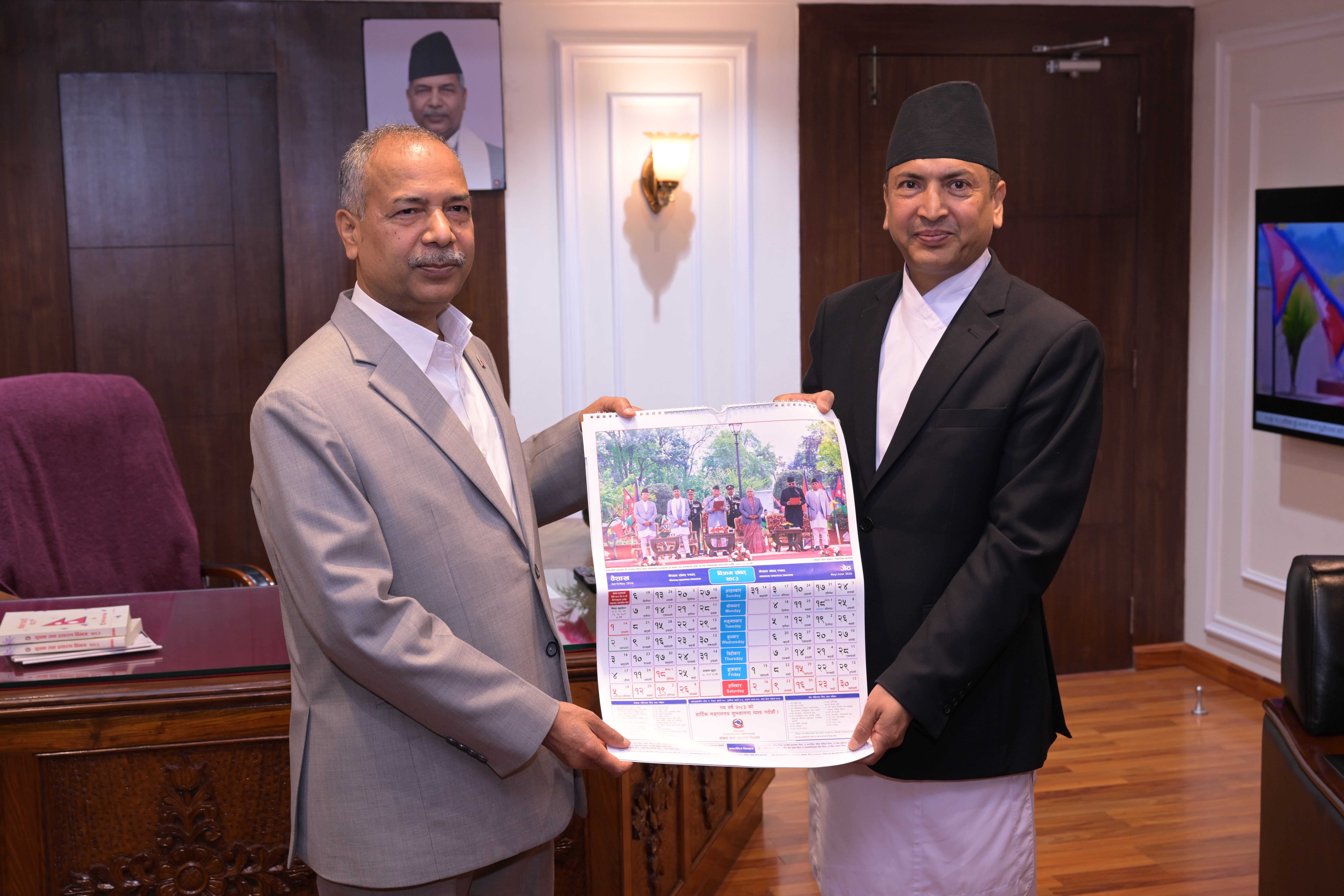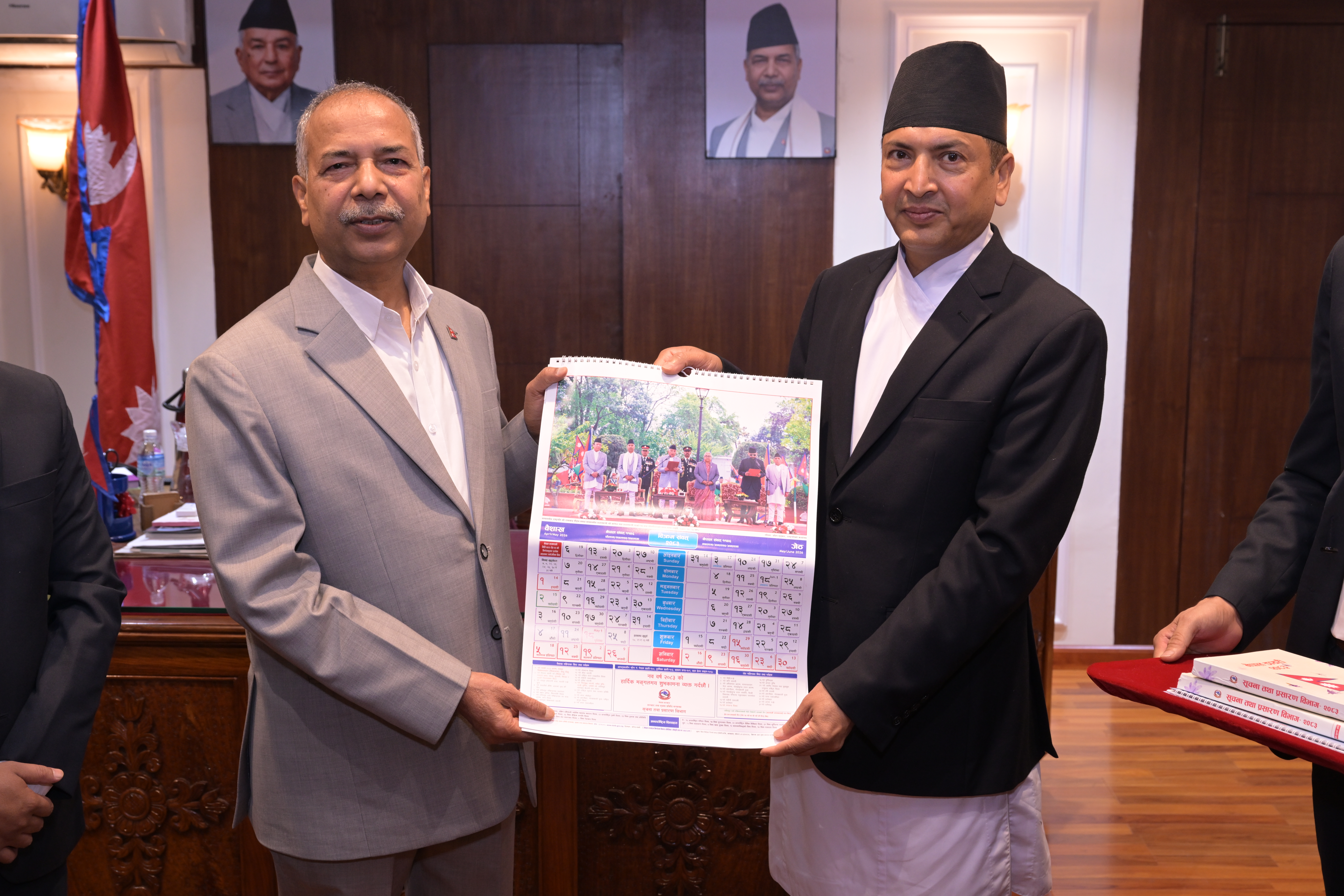 सम्माननीयज्यूहरुलाई २०८३ सालको नेपाल सरकारको आधिकारिक पात्रो तथा नेपाल डायरी पेश गर्नुहुँदै विभागका महानिर्देशक श्री छबिन्द्र पराजुली।