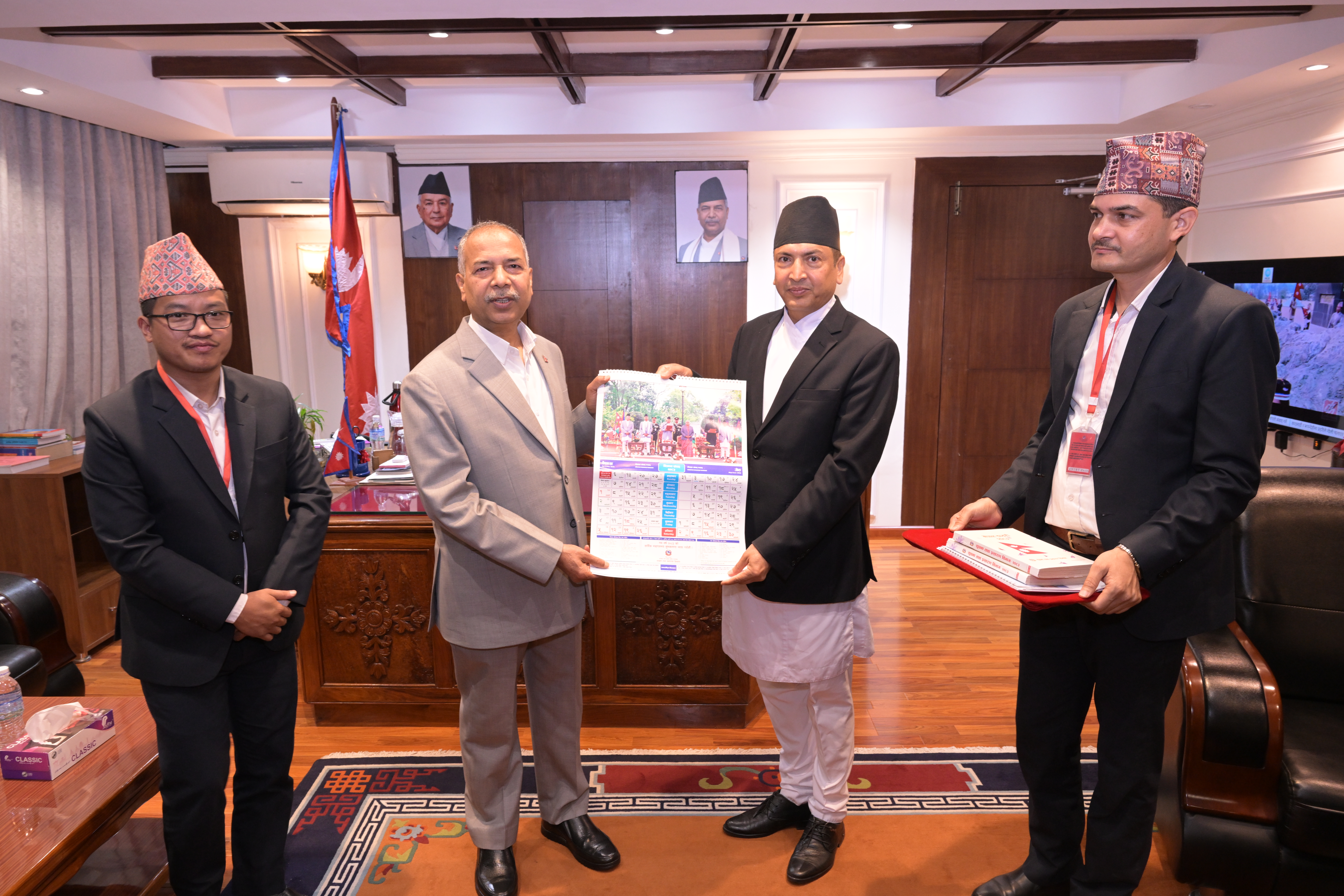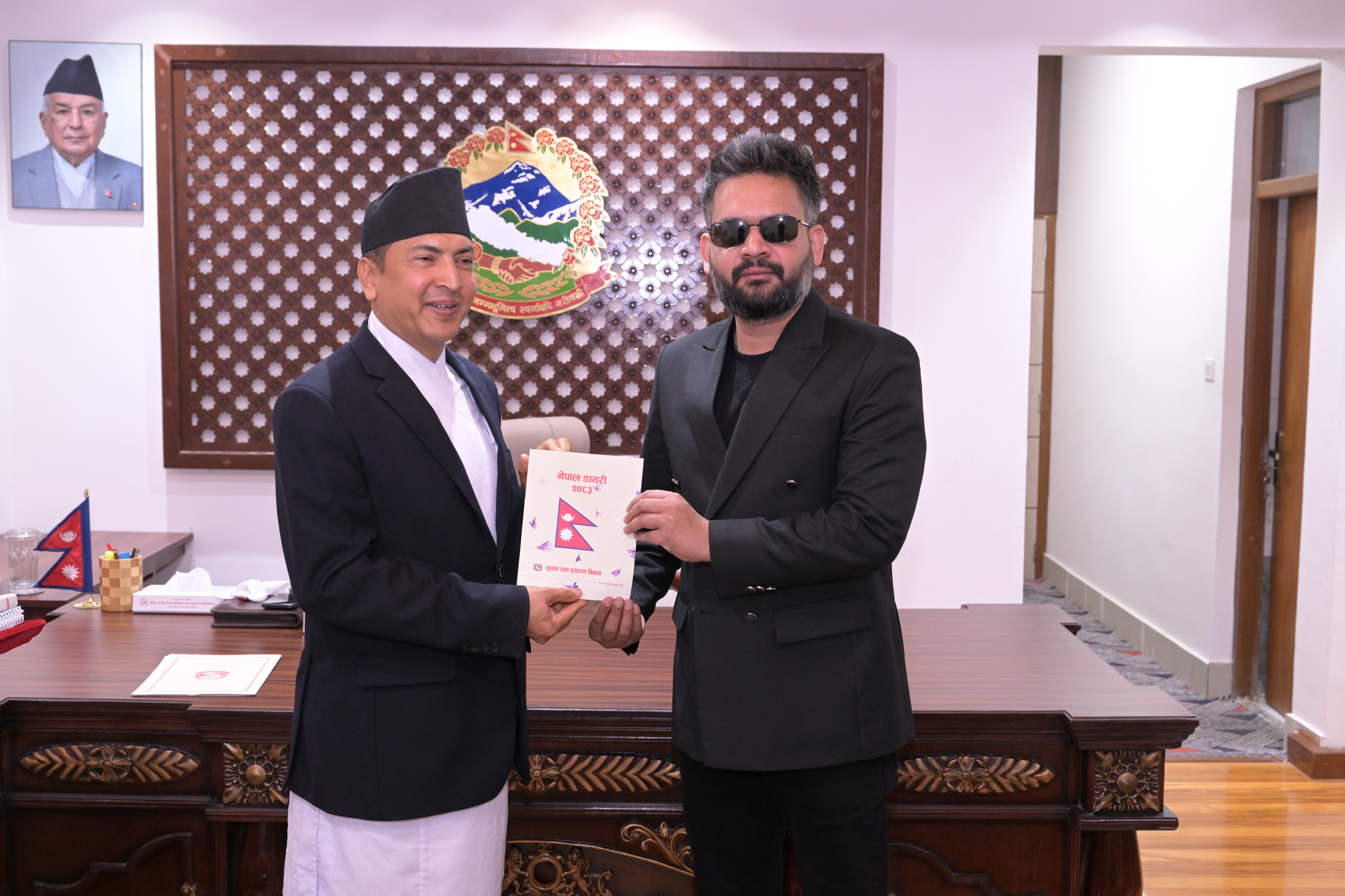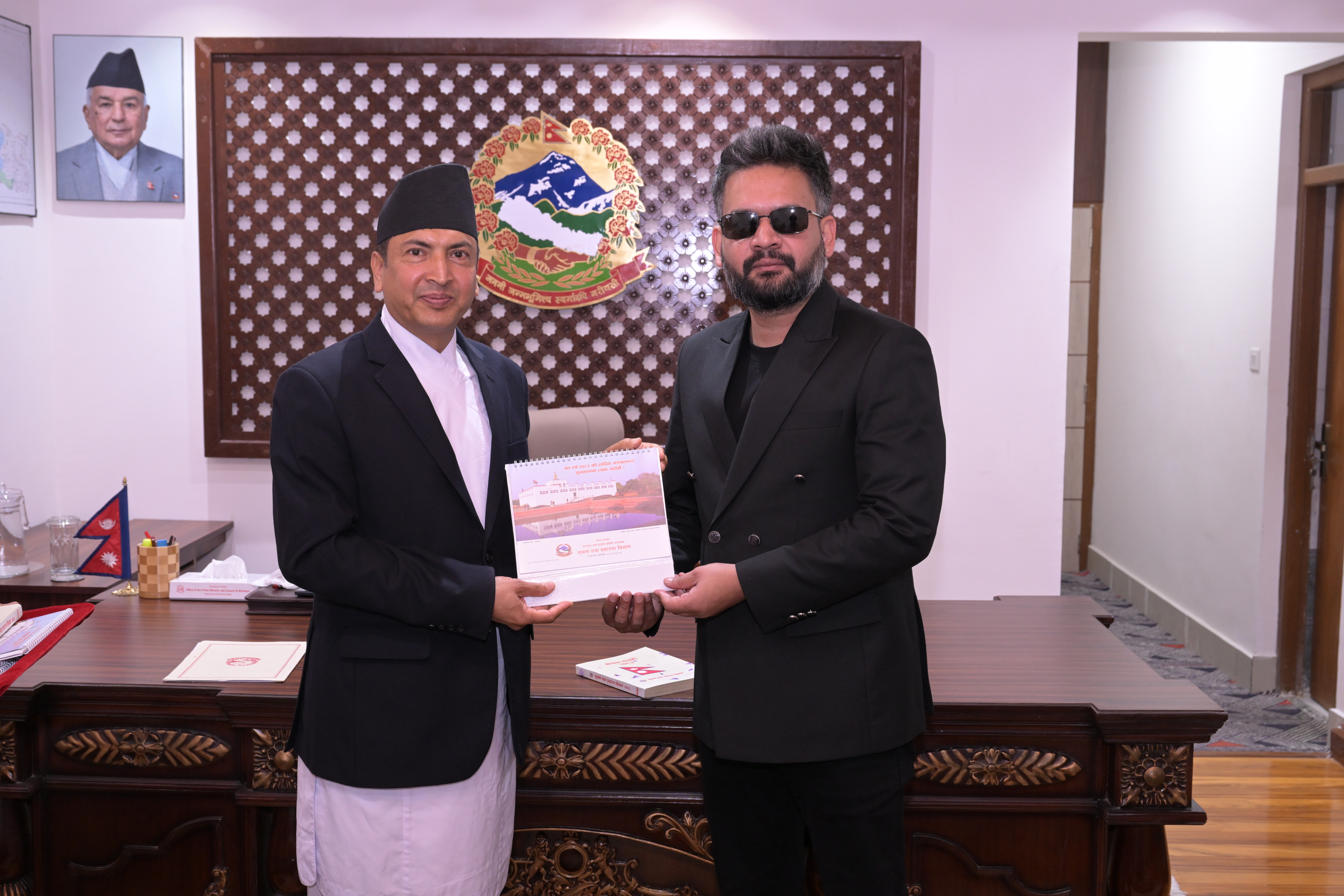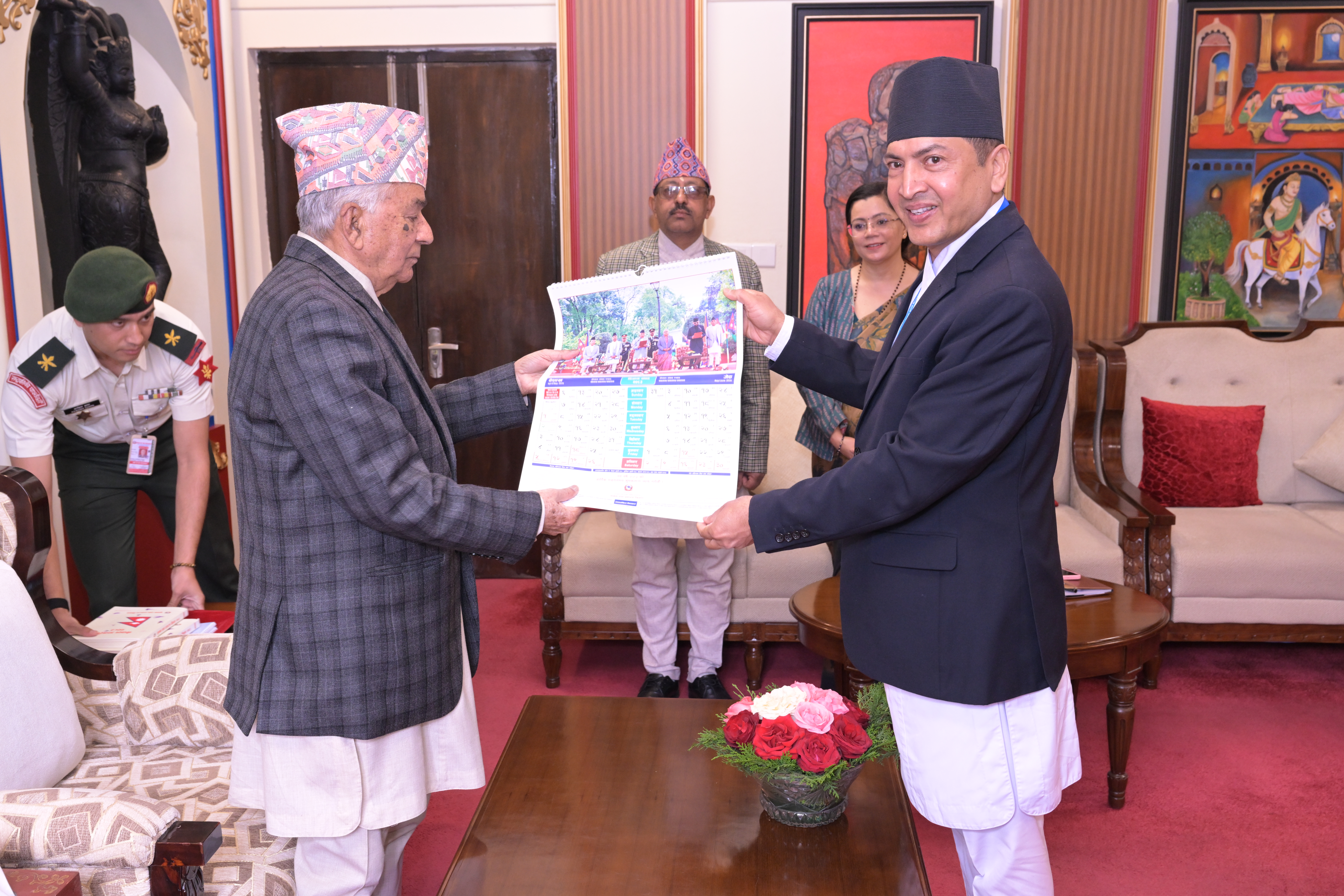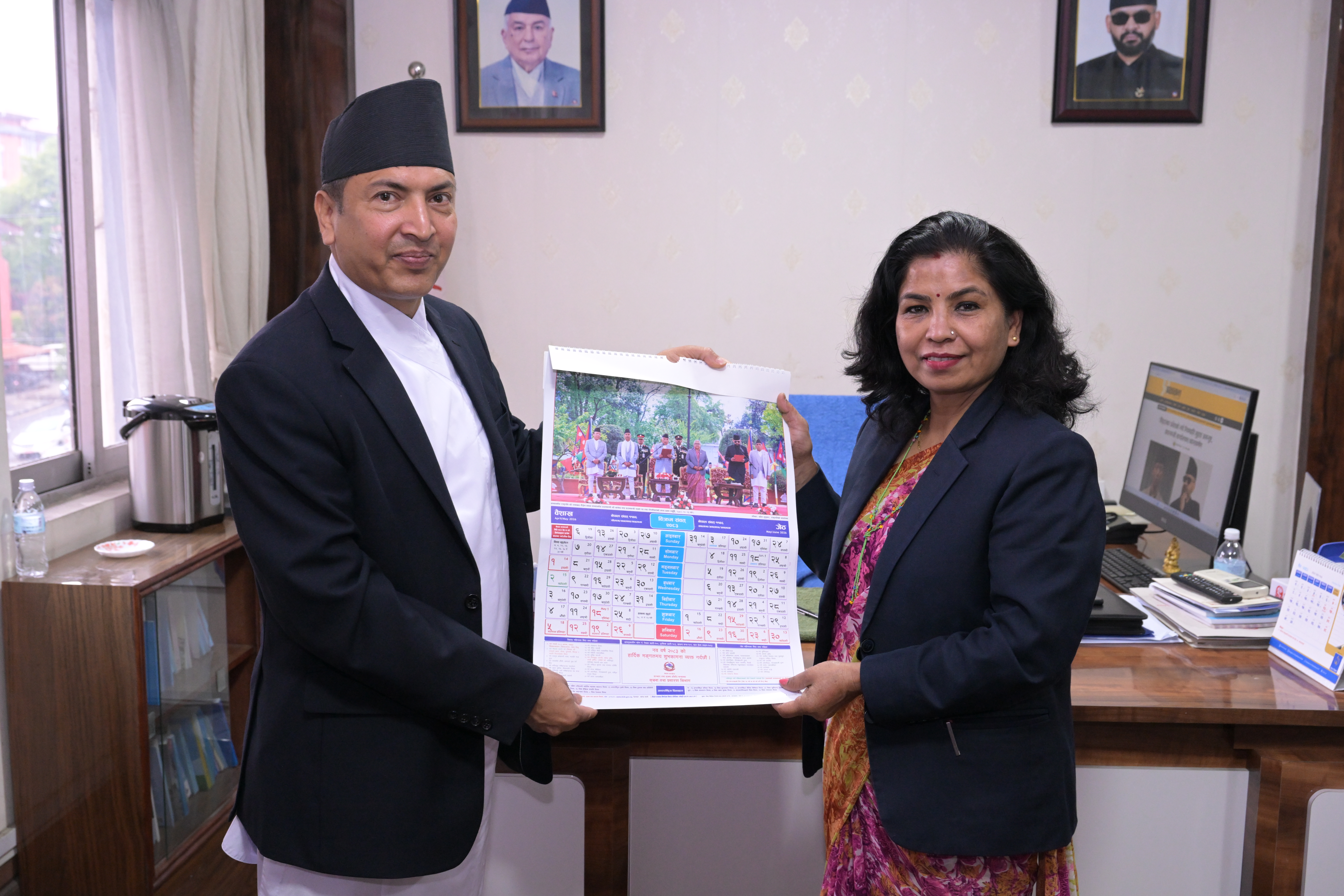 सम्माननीयज्यूहरुलाई २०८३ सालको नेपाल सरकारको आधिकारिक पात्रो तथा नेपाल डायरी पेश गर्नुहुँदै विभागका महानिर्देशक श्री छबिन्द्र पराजुली।