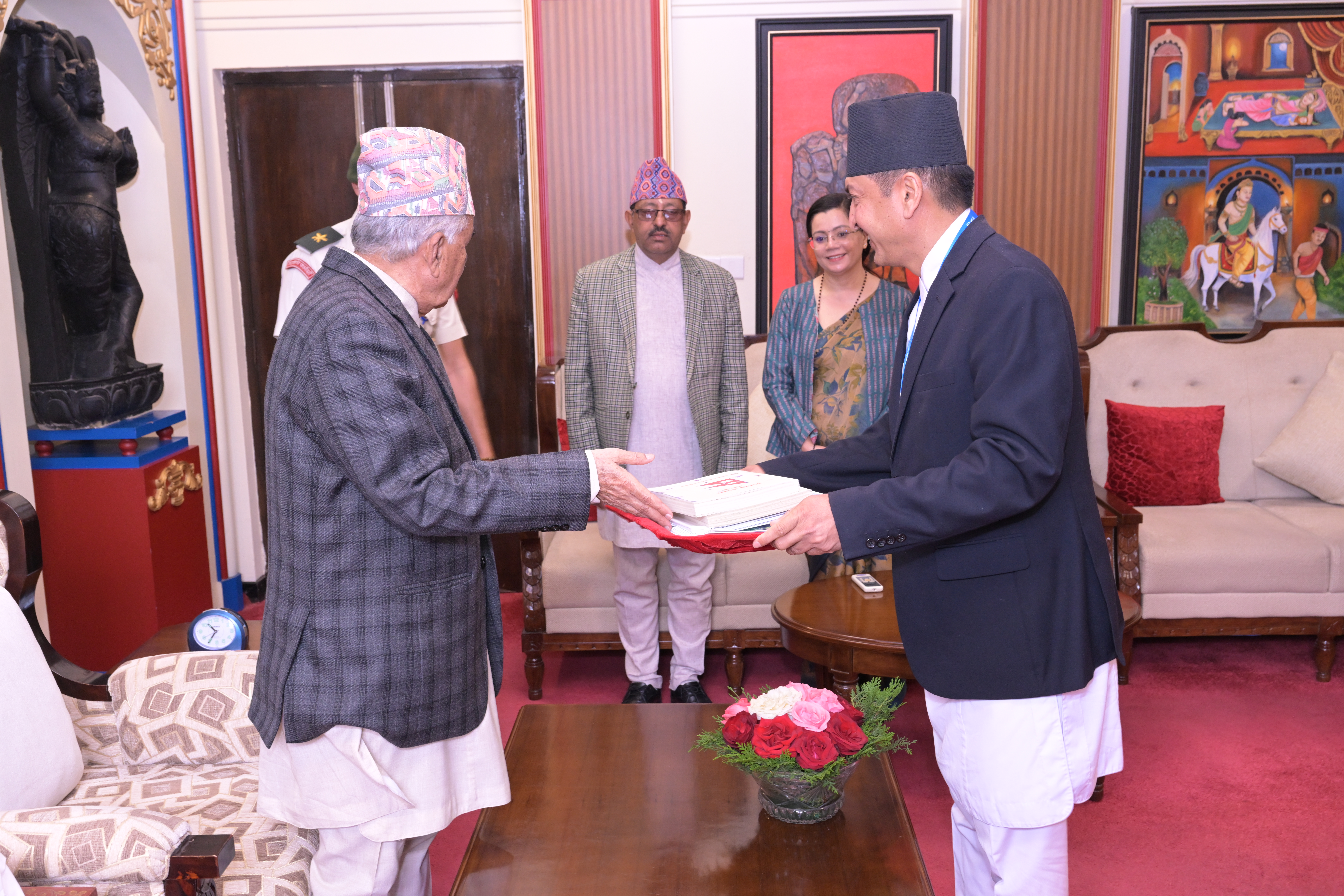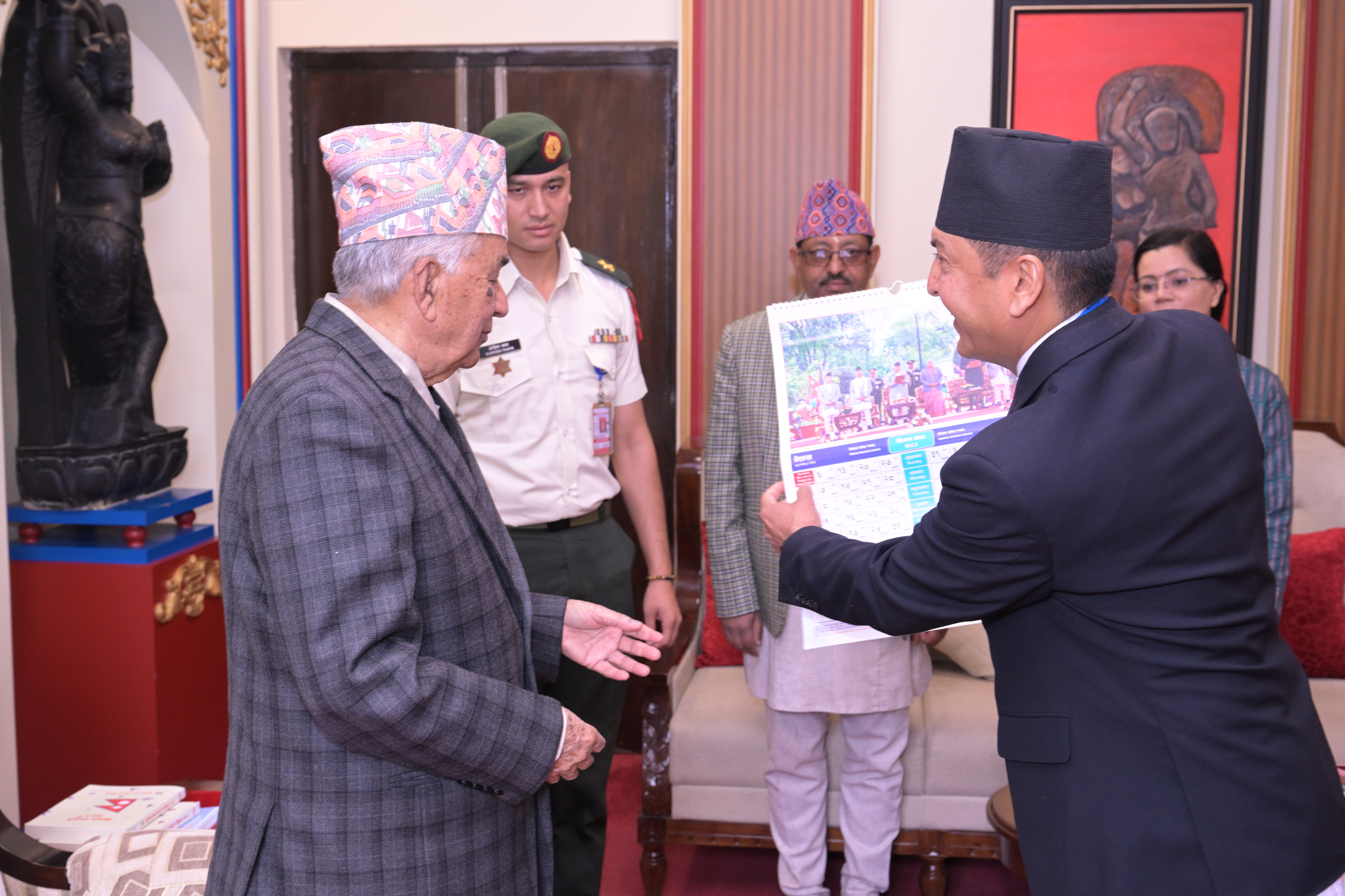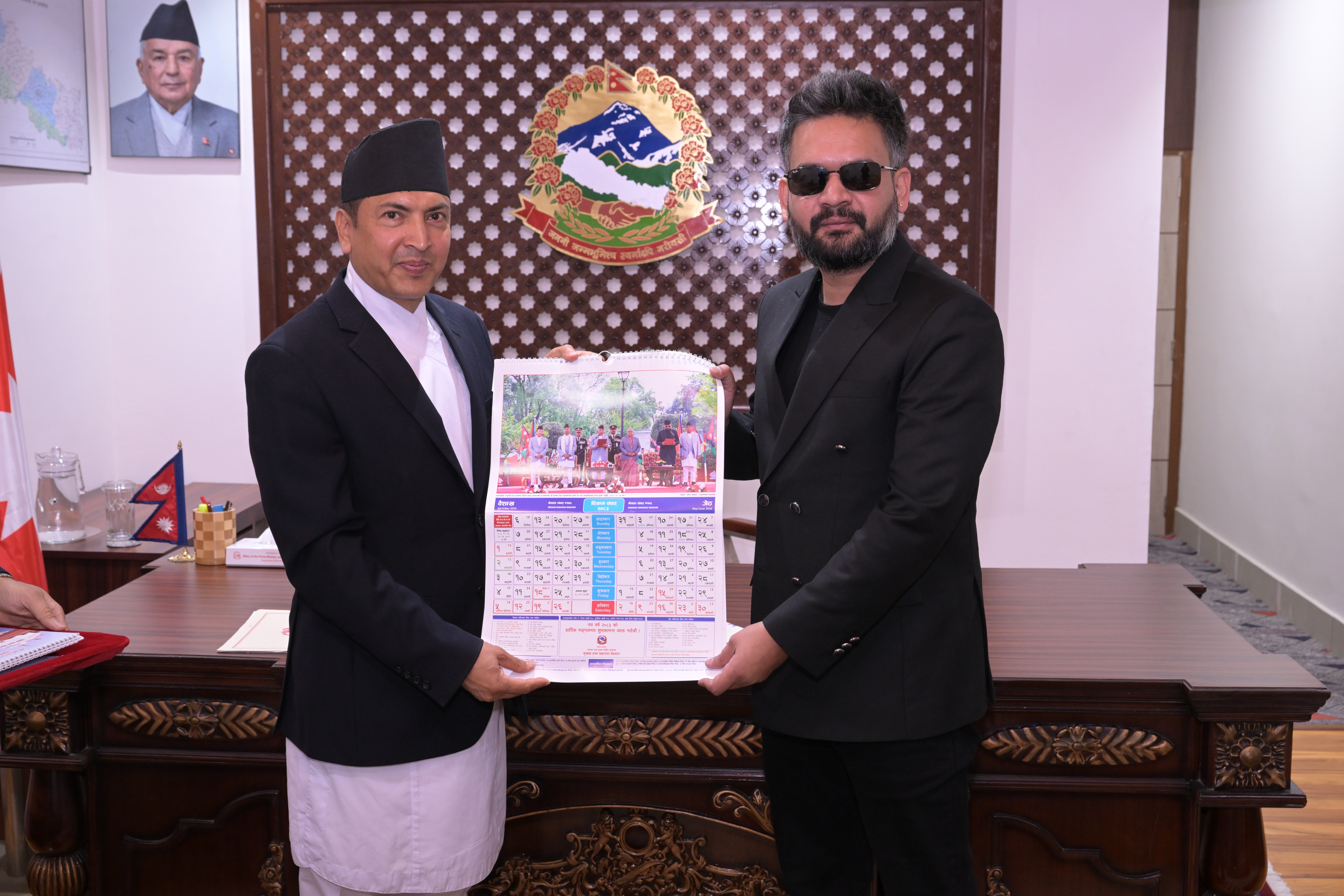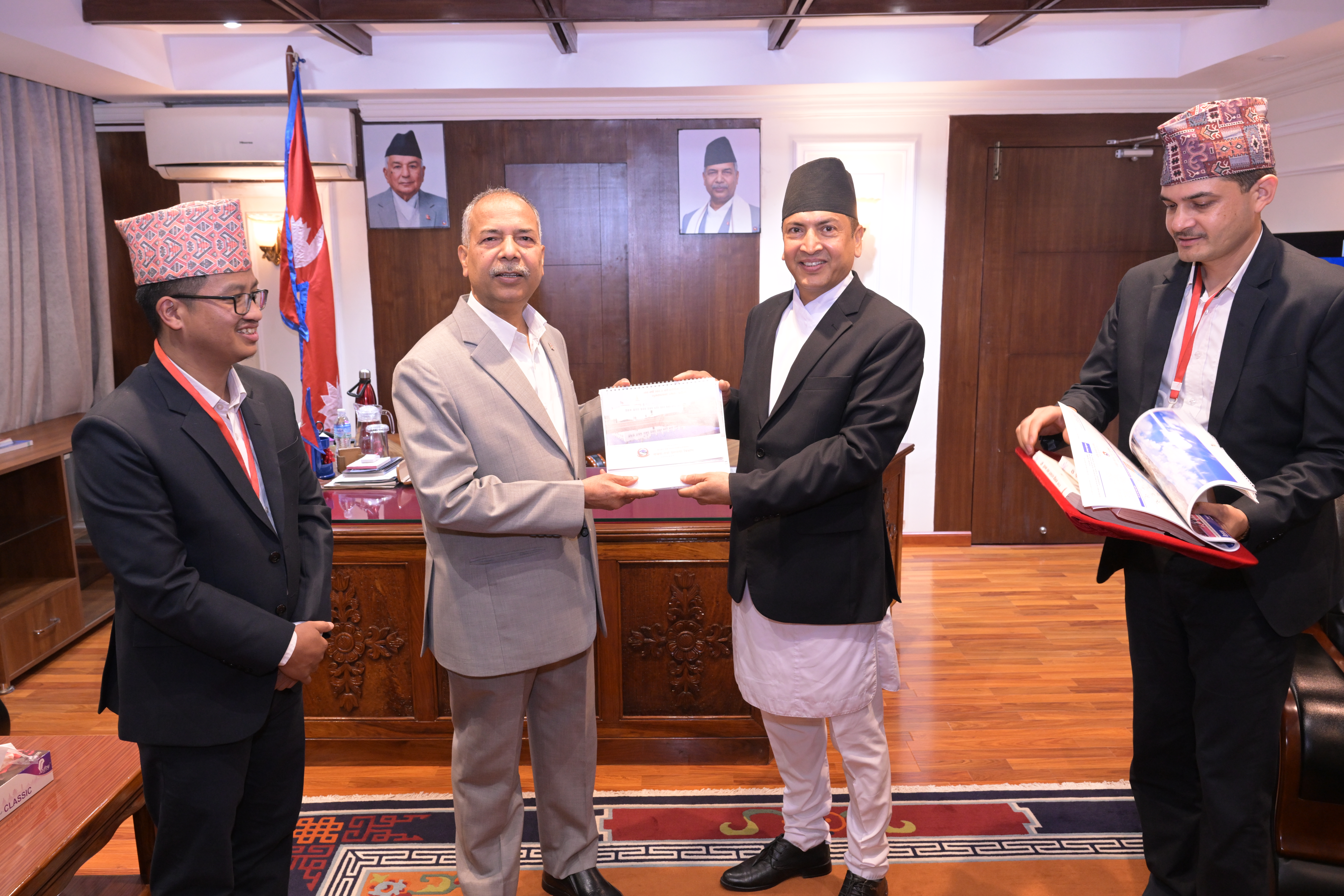 सम्माननीयज्यूहरुलाई २०८३ सालको नेपाल सरकारको आधिकारिक पात्रो तथा नेपाल डायरी पेश गर्नुहुँदै विभागका महानिर्देशक श्री छबिन्द्र पराजुली।